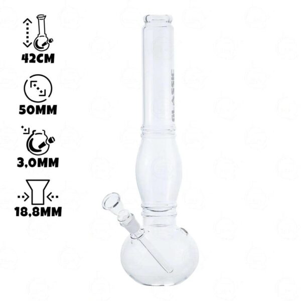 Duże, proste w obsłudze wykonane z najlepszej jakości komponentów. Bongo szklane Glassic to idealne bongo dla początkujących, którzy chcą zacząć przygodę z suszem. Bongo jest wysokie na 42 cm, posiada spory cybuch i dzban na wodę.