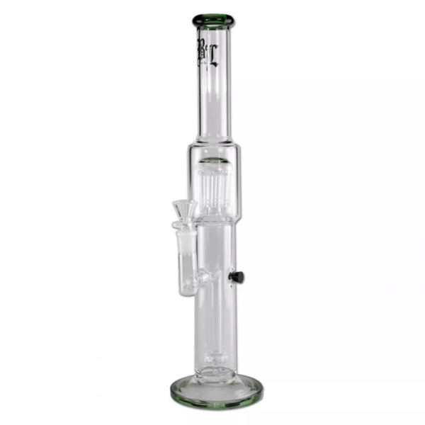 Prezentujemy zaawansowane bongo wodne Black Leaf z filtracją, wyposażone w 12-ramienny perkolator i dyfuzor, które rozbijają i chłodzą dym, ograniczając ilość substancji smolistych przedostających się do płuc. Fajka wodna znajduje się na okrągłej postawie wykończonej eleganckim, zielonym kolorem. Bongo Black Leaf wykonano z borokrzemowego szkła, które jest odporne na wysokie temperatury i zniszczenia.