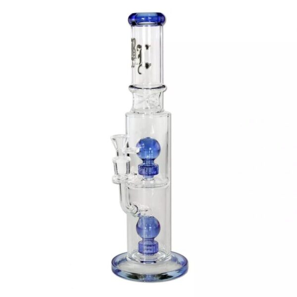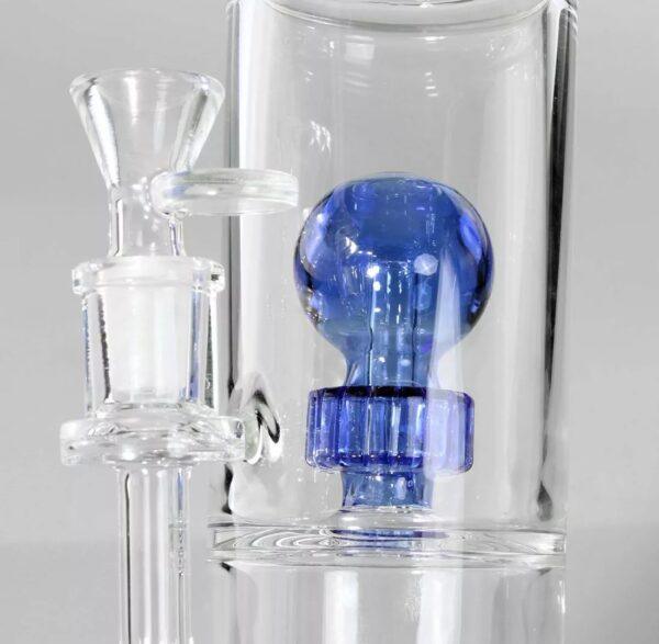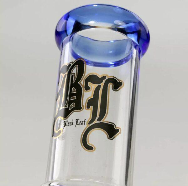 Bongo lodowe Black Leaf z 2 dyfuzorami o wysokości 37 cm i szlifie 14.5 mm. Posiada podwójną filtrację dzięki 2 dyfuzorom ustawionym piętrowo, które rozbijają i schładzają dym. Dzięki nim palenie staje się łagodniejsze dla gardła, a ilość substancji smolistych przedostających się do płuc jest ograniczona. Fajka wodna Black Leaf wykonana jest z grubego i wytrzymałęgo borokrzemowego szkła o grubości 5 mm. Uchwyt na lód umieszczony w rurze pozwala na schłodzenie wody kostkami lodu, co dodatkowo zwiększa przyjemność z palenia. Wyciągany cybuch o szlifie 14.5 mm posiada długi uchwyt, co ułatwia dozowanie suszu. Bongo umieszczone jest na stabilnej, okrągłej podstawie, a całość wykończona jest szerokim niebieskim pierścieniem ustnika. Idealne rozwiązanie dla prawdziwych koneserów.”