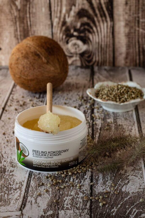 Konopny peeling kokosowy z olejem konopnym działa złuszczająco i ujędrniająco. Pomaga w redukcji martwych komórek naskórka oraz ogranicza powstawanie cellulitu, pomaga również w walce z nim.